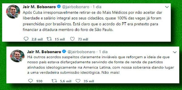 Mas é bom o sr. Bolsonaro já ir se acostumando que não se governa com Twitter nem com leviandades. Existem centenas, milhares de profissionais médicos – e brasileiros, capitão – que estão, nos municípios, preocupadíssimos com a provável falta de médicos, seja por que os que entram no programa saem de sua rede de atendimento.