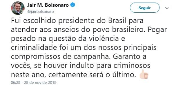 Pois Jair Bolsonaro, com seu “Deus acima da tudo” anuncia que, se o STF confirmar o indulto hoje, este será “o último”.