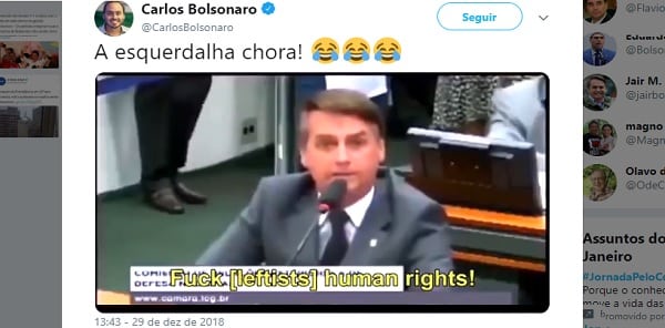 Josias de Souza, no UOL, chama a atenção para o vídeo que – ontem, dois antes da posse do pai como Presidente – o filho “02”, Carlos Bolsonaro, orgulhosamente distribui pelo Twitter.