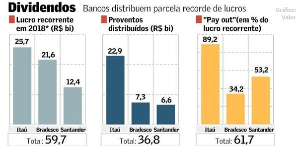 Os três maiores bancos privados do país distribuíram R$ 36,8 bilhões aos acionistas relativos ao ano passado nas formas de dividendos, juros sobre o capital próprio (JCP) e recompra de ações. O número equivale a 61,7% do lucro líquido ajustado que Itaú Unibanco, Bradesco e Santander alcançaram juntos em 2018, de R$ 59,695 bilhões.