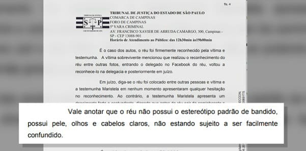 A juíza Lissandra Reis Ceccon, da 5ª Vara Criminal de Campinas, acatou o reconhecimento de um acusado de latrocínio porque a testemunha não poderia ter se confundido, já que o denunciado “não possui estereótipo de bandido” por ter “pele, olhos e cabelos claros”.