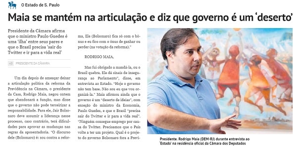A declaração de Rodrigo Maia, presidente da Câmara, mna manchete do Estadão, é quase um pleonasmo. Qualquer pessoa com uma capacidade mediana de enxergar através da cortina de fumaça do agressivo moralismo e da “pauta de costumes” erguida pelo bolsonarismo sabe, há muito tempo, que este não tem um projeto para o país, apenas o seu aniquilamento.