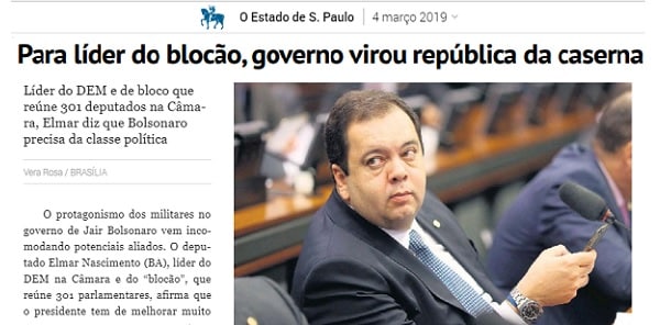 A chiadeira do deputado Elmar Nascimento, líder do aglomerado de direita e centro-direita coordenado pelo DEM de Rodrigo Maia, não esperou nem isso e botou o “Blocão” na rua, pedindo um chega pra lá na ocupação dos espaços pela ala de verde-oliva.