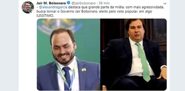No twitter, posta “comentário” do ex-global Alexandre Garcia em que ele nega que Maia fosse articulador da reforma da Previdência na Câmara e onde diz que a imprensa tenta fazer do ex-capitão um presidente ilegítimo.