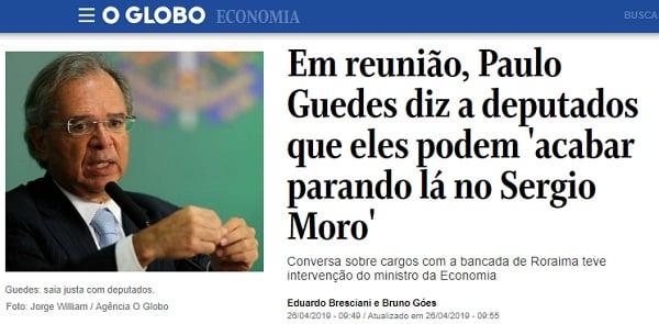 Numa reunião com o governador e deputados de Roraima, o sr. Paulo Guedes, ao intervir sobre uma discussão sobre indicados a cargos federais naquele Estado, disse aos parlamentares que que “se a negociação política continuar a ser feita com base na ocupação de cargos no governo “iam acabar parando lá no Sérgio Moro”.
