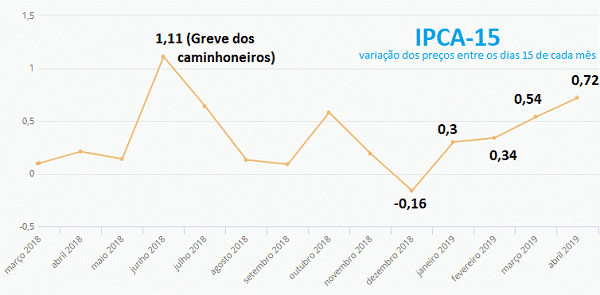Pior: até junho, a tendência é de forte alta no acumulado da inflação em 12 meses, que suporta os cálculos de preço e de juros com base na variação passada (ex post, na linguagem dos economistas). Os índices de março e abril deste anos foram o triplo dos correspondentes a estes meses no ano passado e a tendência é que isso se repita, ao menos, no próximo mês, maio, que teve, em 2018, um IPCA-15 de apenas 0,14%.