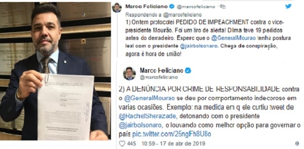 O deputado Pastor Marco Feliciano, vice-líder do Governo, protocolou na Câmara um pedido de impeachment do vice-presidente Hamilton Mourão.