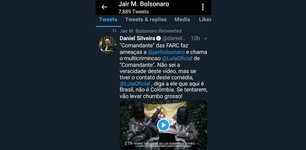 Republica, da conta do marombeiro Daniel Silveira – o “vou foder todo mundo” – um vídeo que este “chupou da deputada pesselista Bia Kicis, onde um sujeito fantasiado de guerrilheiro das Farc colombianas chama Lula de “comandante” e, com uma bandeira (de Bolívia e não da Colômbia) recém-saída de uma loja, ainda com os vincos, promete uma ofensiva revolucionária sobre o Brasil.