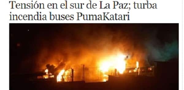 Num protesto espontâneo, populares da zona sul de La Paz incendiaram uma garagem de ônibus e o candidato da oposição, derrotado, exigiu a intervenção da polícia, pretendendo impor-se como autoridade nacional.