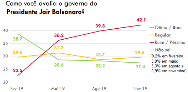 A imagem negativa do governo não para de subir e passou de 39,8 para 42,1% os que o julgam ruim ou péssimo, enquanto o ótimo ou bom fica apenas em 27,4%.